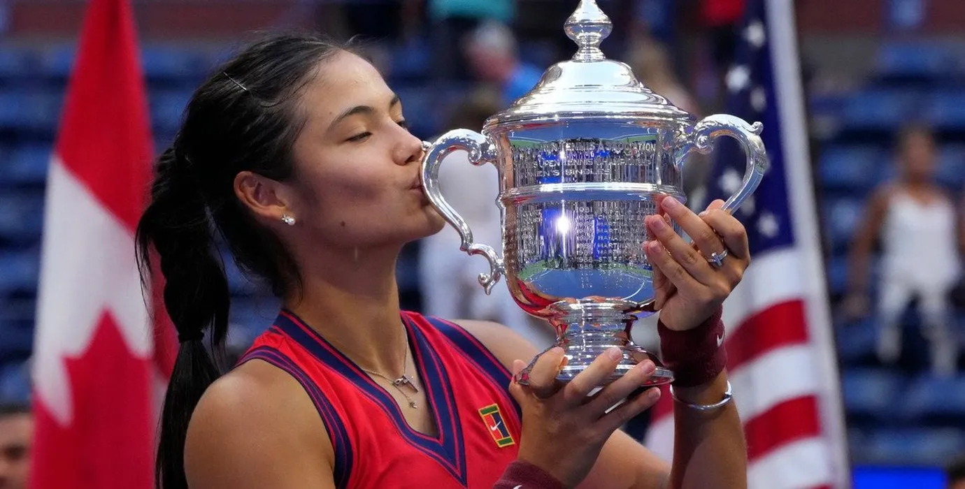 Britain's Emma Raducanu kisses the trophy after winning the 2021 US Open Tennis tournament women's final match against Canada's Leylah Fernandez at the USTA Billie Jean King National Tennis Center in New York, on September 11, 2021.,Image: 631656159, License: Rights-managed, Restrictions: , Model Release: no, Credit line: Profimedia