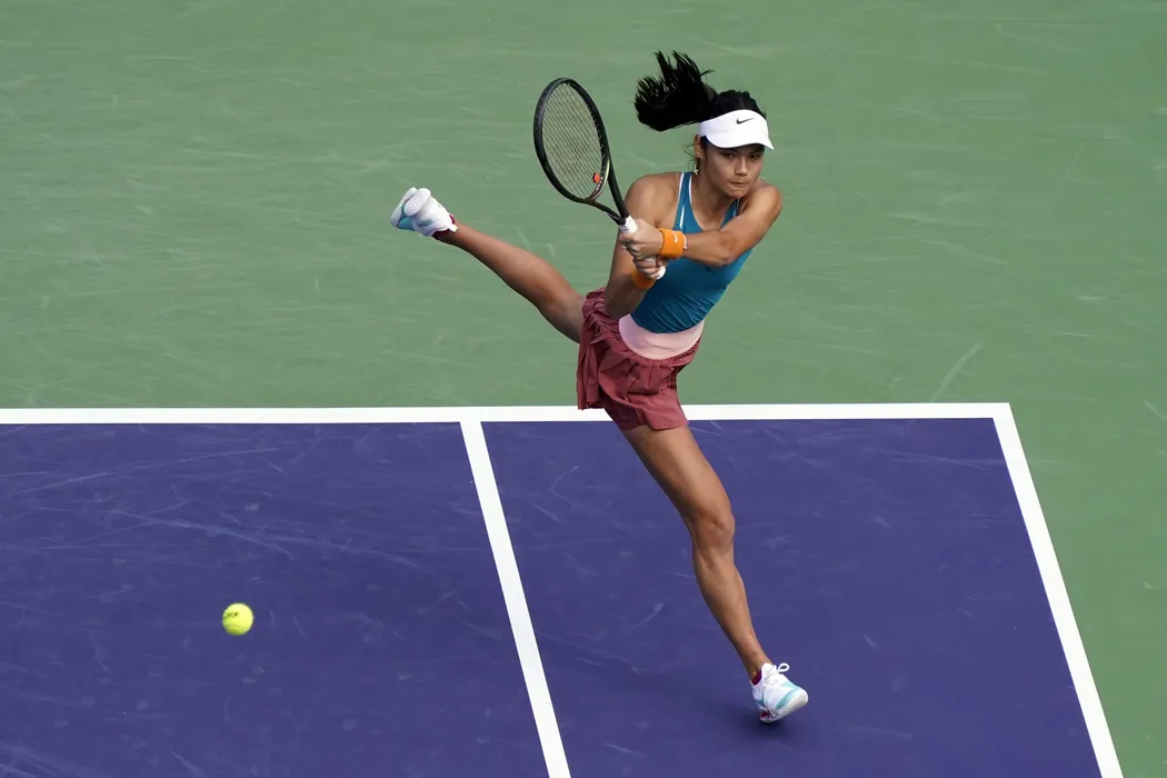 Emma Raducanu of Britain returns to Petra Martic of Croatia at the BNP Paribas Open tennis tournament Sunday, March 13, 2022, in Indian Wells, Calif. (AP Photo/Marcio Jose Sanchez)