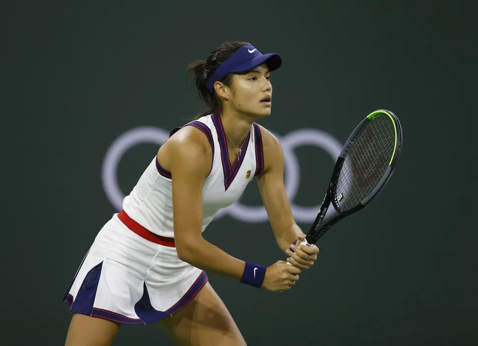Emma Raducanu gets ready to return a serve from Alaksandra Sasnovich at the BNP Paribas Open at Indian Wells Tennis Garden in Indian Wells, California. Mandatory Photo Credit : Charles Baus/CSM