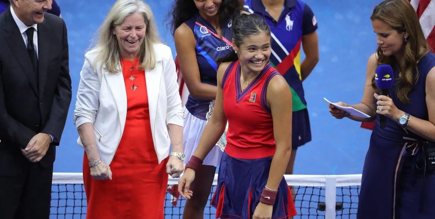Winner Britain's Emma Raducanu (C) smiles as runner-up Canada's Leylah Fernandez (C back) looks on after the 2021 US Open Tennis tournament women's singles final match at the USTA Billie Jean King National Tennis Center in New York, on September 11, 2021.,Image: 631669833, License: Rights-managed, Restrictions: , Model Release: no, Credit line: Profimedia