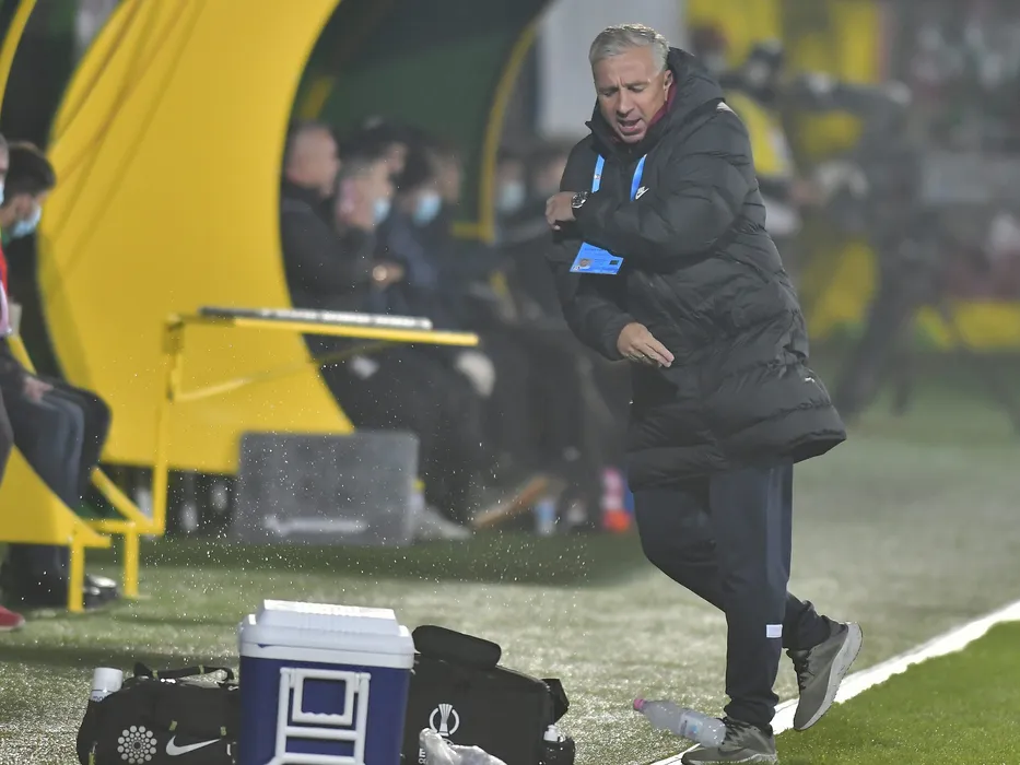 Dan Petrescu arunca o sticla de apa in meciul de fotbal dintre Rapid Bucuresti si CFR Cluj, contand pentru Liga 1 Casa Pariurilor, desfasurat pe Stadionul Orasenesc din Mioveni, duminica 17 octombrie 2021. © FOTO:Razvan Pasarica/SPORT PICTURES