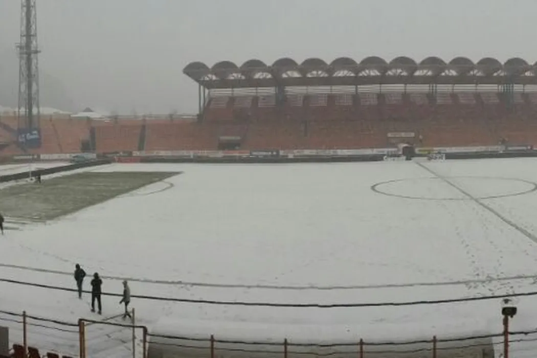Emoții pentru starea gazonului, înainte de Ceahlăul – Steaua. FOTO | Terenul a fost acoperit de zăpadă
