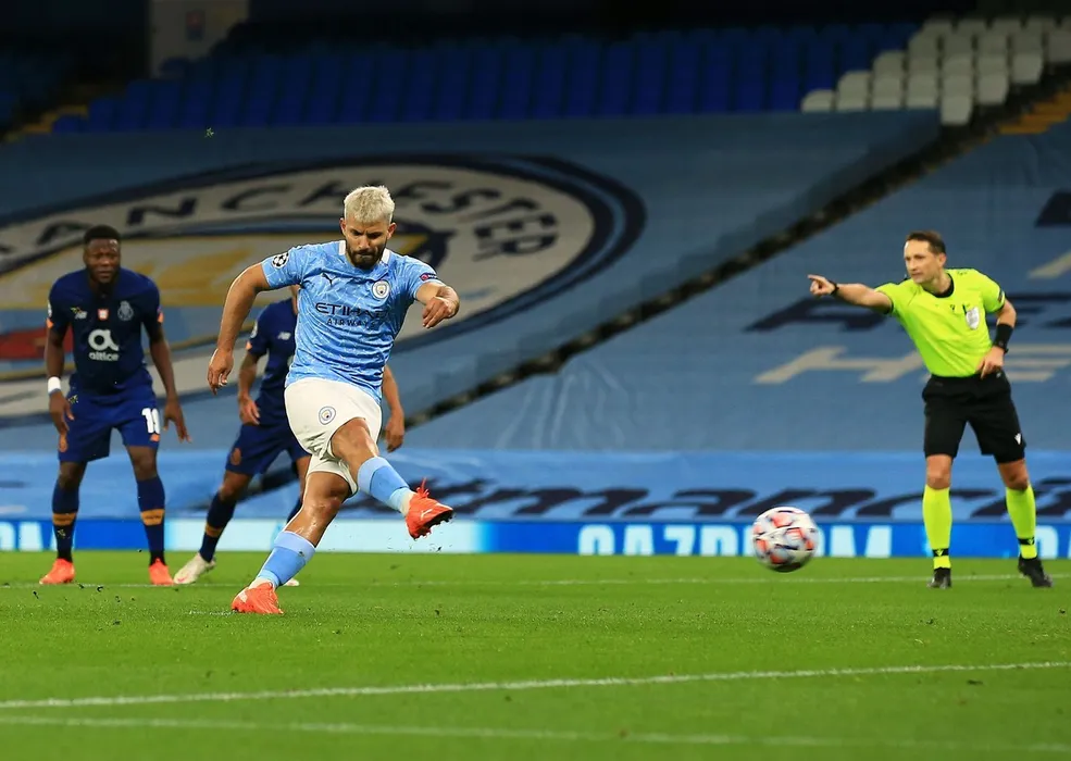 Sergio Aguero of Manchester City scores a goal from the penalty spot to make it 1-1