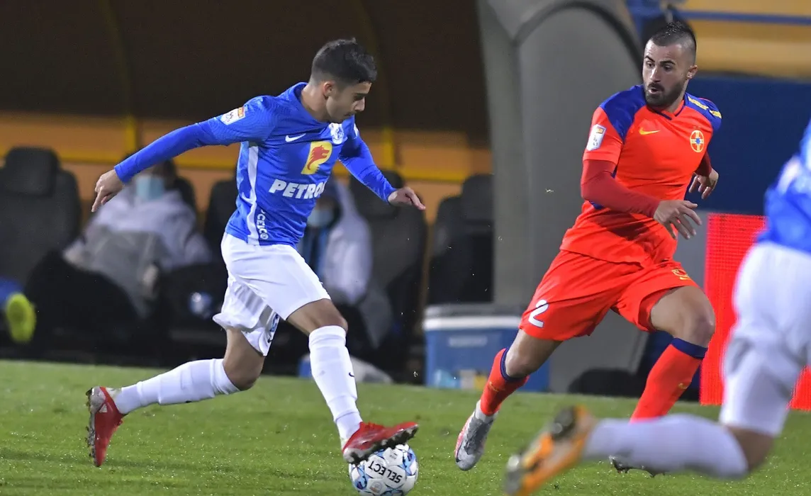 Enes Sali si Valentin Cretu in meciul de fotbal dintre Farul Constanta si FCSB, contand pentru Liga 1 Casa Pariurilor, desfasurat pe Stadionul central al Academiei Gheorghe Hagi din Ovidiu, joi 4 noiembrie 2021. © FOTO:Razvan Pasarica/SPORT PICTURES