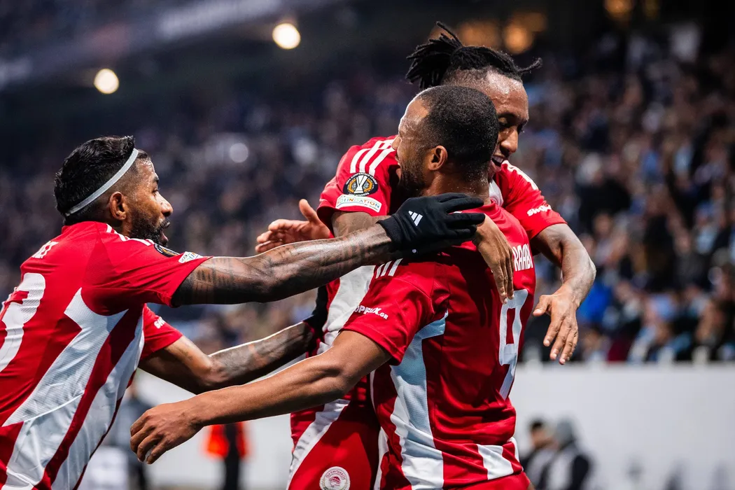 MALMÖ FF - OLYMPIACOS FC Ayoub El Kaabi, Gelson Martins, Rodinei after the goal of Olympiacos during the UEFA Europa League, league stage match between Malmö FF and Olympiacos FC. Eleda Stadion, Malmo, Sweden, October 24, 2024. Photo by Branislav Racko Copyright: xx _BRR3096,Image: 926128956, License: Rights-managed, Restrictions: , Model Release: no