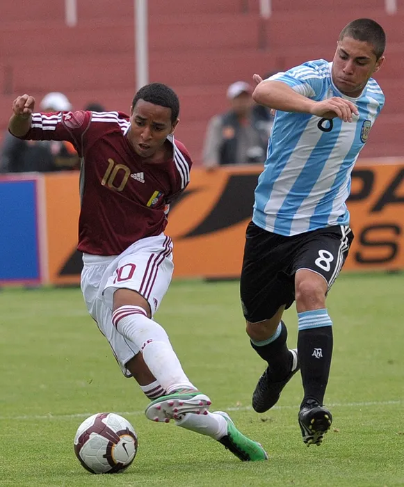 Venezuela's footballer Yohandry Orozco (L) is challenged by Argentina’s Ezequiel Cirigliano during an Under-20 South American championship match held at the UNPA Stadium in Arequipa, 1,000 km south of Lima, on January 22, 2011.,Image: 89771668, License: Rights-managed, Restrictions: , Model Release: no
