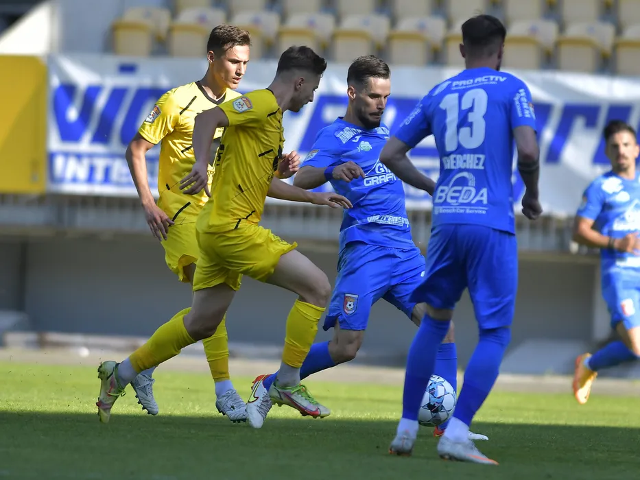Petru Dragos Iancu, Daniel Constantin Florea si Raul Ovidiu Steau in meciul de fotbal dintre Chindia Targoviste si Gaz Metan Medias, contand pentru Play-out-ul Ligii 1 Casa Pariurilor, desfasurat pe Stadionul Ilie Oana din Ploiesti, vineri 13 mai 2022. © FOTO:Razvan Pasarica/SPORT PICTURES