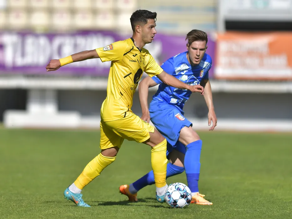 Paul Costelus Costea si Daniel Marinel Celea in meciul de fotbal dintre Chindia Targoviste si Gaz Metan Medias, contand pentru Play-out-ul Ligii 1 Casa Pariurilor, desfasurat pe Stadionul Ilie Oana din Ploiesti, vineri 13 mai 2022. © FOTO:Razvan Pasarica/SPORT PICTURES