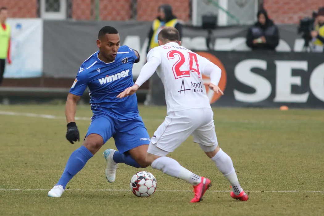 Eric de Oliveira (S), de la FC Voluntari, reactioneaza dupa ce a inscris un gol, in timpul meciului de fotbal contra echipei AFC Hermannstadt din etapa 26 a Ligii 1, disputat pe stadionul Anghel Iordanescu din Voluntari, sambata, 22 februarie 2020. GEORGE FILIP / MEDIAFAX FOTO