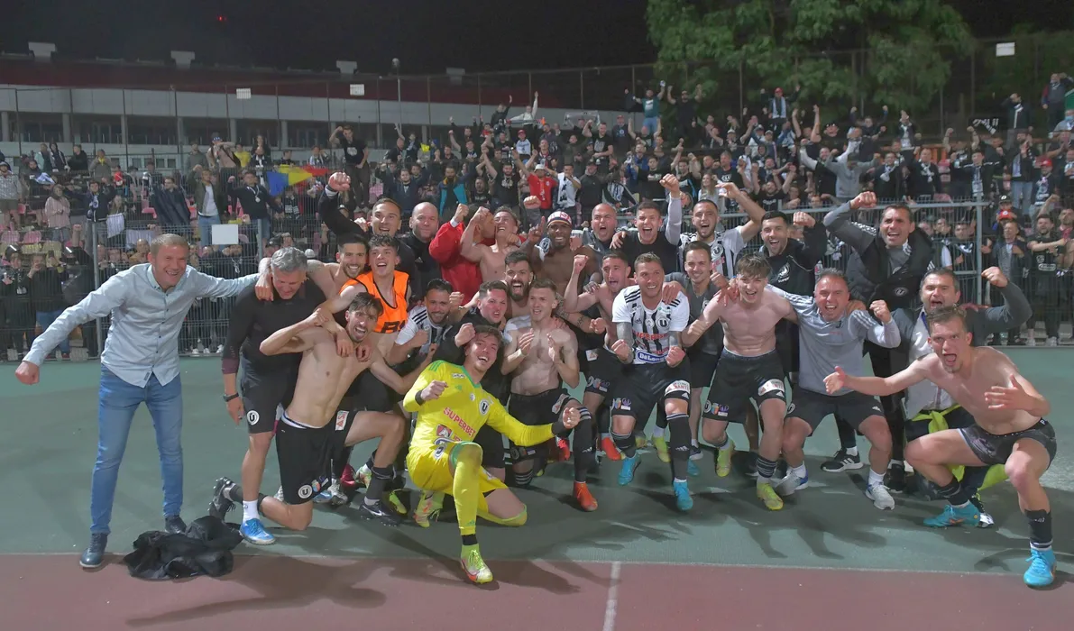 Fotbalistii clujeni se bucura intr-o fotografie de grup alaturi de suporteri dupa promovarea pe prima scena a tarii in urma meciului de fotbal dintre Dinamo Bucuresti si Universitatea Cluj, Barajul pentru mentinerea in Liga 1 Casa Pariurilor, desfasurat pe Stadionul Dinamo din Bucuresti, duminica 29 mai 2022. © FOTO:Razvan Pasarica/SPORT PICTURES