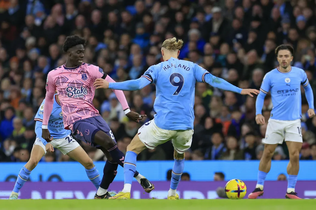 Premier League Manchester City v Everton Amadou Onana 8 of Everton passes the ball beyond Erling Haaland 9 of Manchester City during the game the Premier League match Manchester City vs Everton at Etihad Stadium, Manchester, United Kingdom, 31st December 2022 Photo by Conor Molloy/News Images Manchester Etihad Stadium Manchester United, ManU Kingdom Copyright: xConorxMolloy/NewsxImagesx