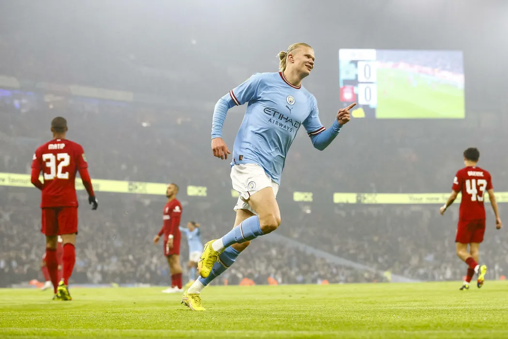 Manchester City v Liverpool 22 December 2022, Manchester - Carabao Cup Fourth Round Football - Manchester City v Liverpool. Erling Haaland of Manchester City celebrates after scoring their first goal to make the score 1-0 photo by Daniel Chesterton Manchester UK *** Manchester City gegen Liverpool 22. Dezember 2022, Manchester Carabao Cup Vierte Runde Fußball Manchester City gegen Liverpool Erling Haaland von Manchester City jubelt nach seinem ersten Tor zum 1 PUBLICATIONxINxGERxSUIxAUTxONLY Copyright: xDanielxChestertonxOffside