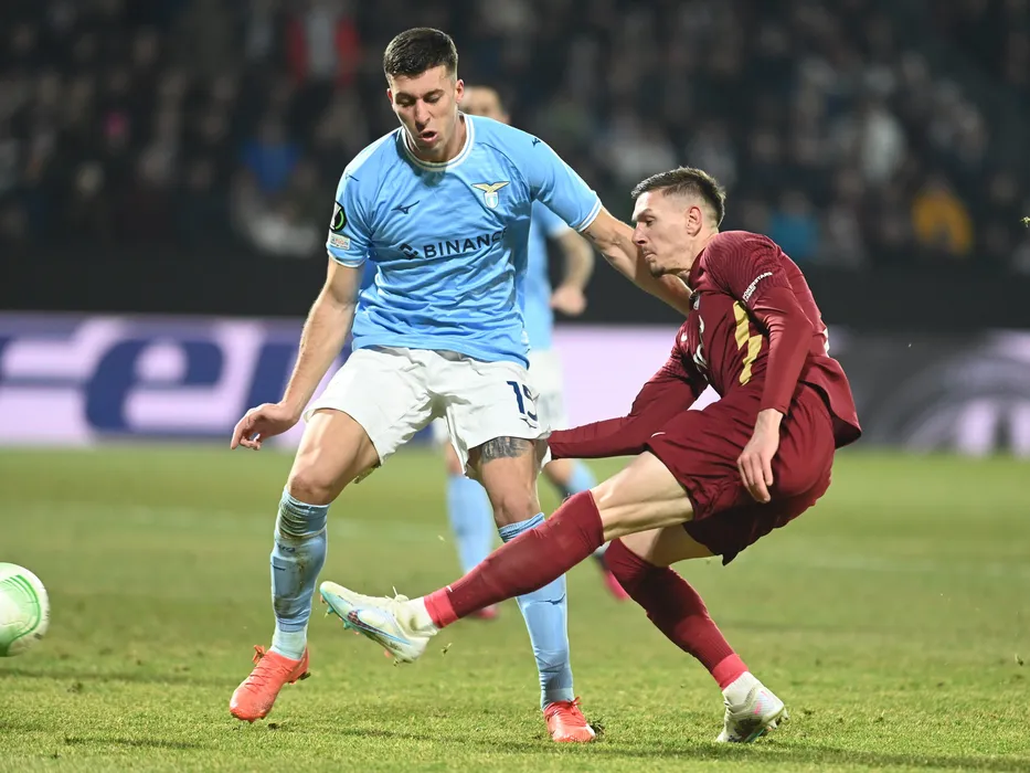 Nicolò Casale si Ermal Krasniqi in meciul de fotbal dintre CFR Cluj si SS Lazio, din cadrul UEFA Europa Conference League, desfasurat pe Stadionul Dr. Constantin Radulescu din Cluj Napoca, joi 23 februarie 2023. © FOTO:Razvan Pasarica/SPORT PICTURES