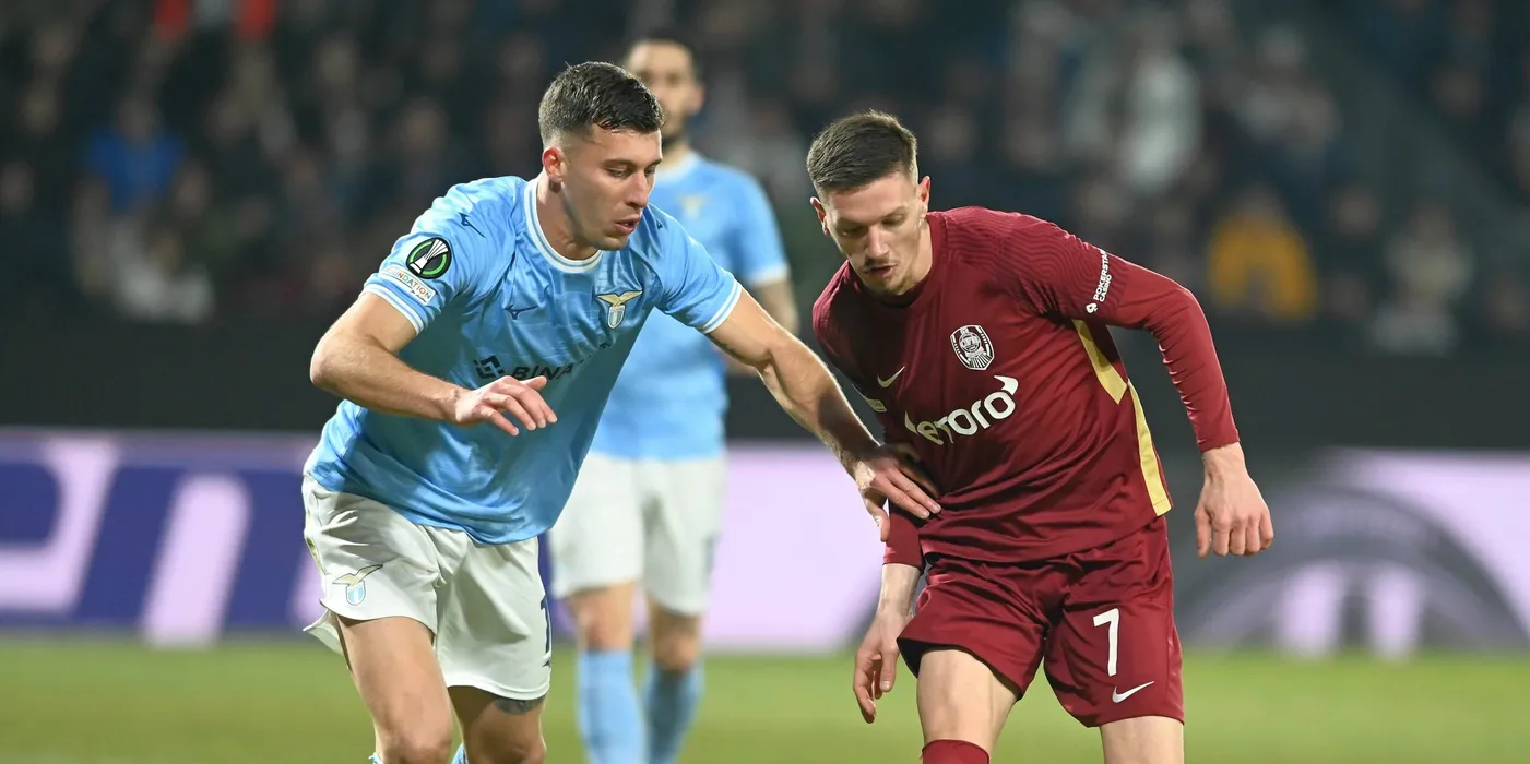 Nicolò Casale si Ermal Krasniqi in meciul de fotbal dintre CFR Cluj si SS Lazio, din cadrul UEFA Europa Conference League, desfasurat pe Stadionul Dr. Constantin Radulescu din Cluj Napoca, joi 23 februarie 2023. © FOTO:Razvan Pasarica/SPORT PICTURES