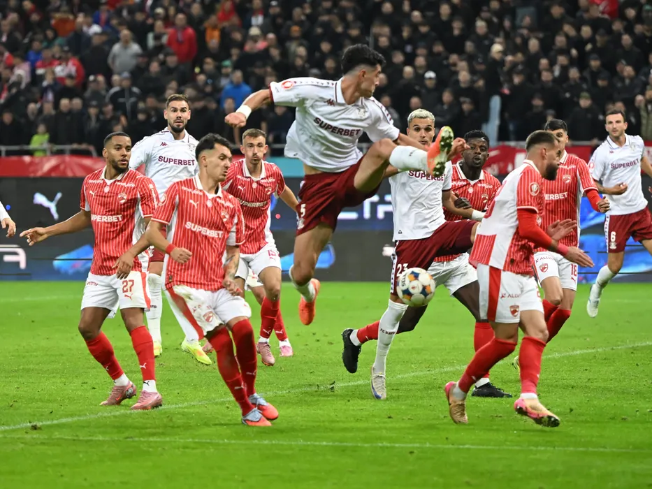 Maxime James Sivis, Elvir Koljic, Raul Marian Oprut, Alexandru Stefan Pascanu, Cristian Marian Manea, Vhakka Eddy Stelh Gnahore si Charalampos Kyriakou la faza unui gol rapidist reusit in meciul de fotbal dintre Dinamo Bucuresti si Rapid Bucuresti, din cadrul Superligii Superbet, desfasurat pe Arena Nationala din Bucuresti, duminica 19 octombrie 2025. © FOTO:Razvan Pasarica/SPORT PICTURES