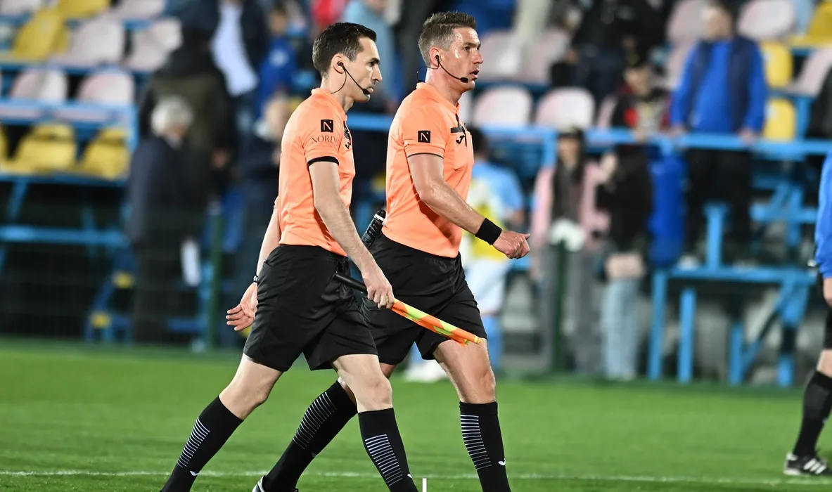 Arbitrul asistent Mihai Marius Marica si arbitrul central Szabolcs Kovacs parasesc terenul dupa meciul de fotbal dintre FC Voluntari si FC Hermannstadt, contând pentru Play-out-ul Superligii Superbet, desfășurat pe Stadionul Anghel Iordanescu din Voluntari, vineri 29 martie 2024. © FOTO: Răzvan PĂSĂRICĂ/SPORT PICTURES
