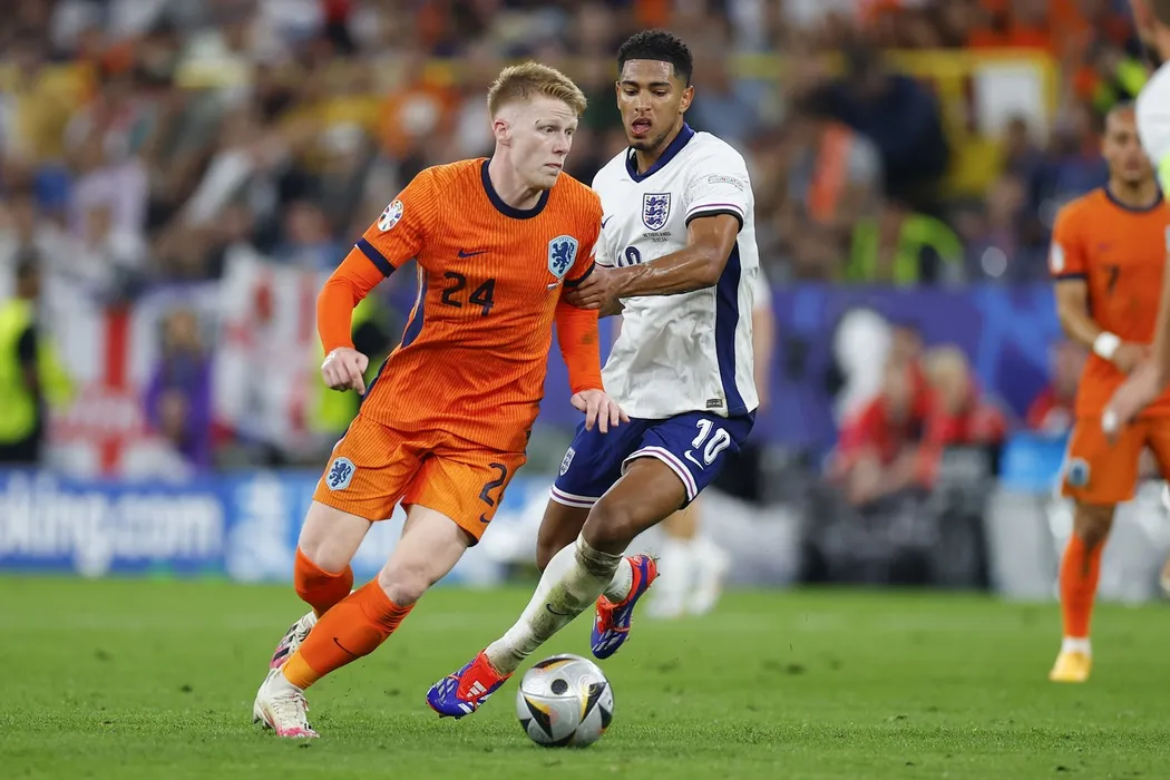 DORTMUND, 10-07-2024, BVB Stadium , European Football Championship Euro2024, Semi finals match no.50 between Netherlands and England. (L-R) Netherlands player Jerdy Schouten, England player Jude Bellingham,Image: 888866805, License: Rights-managed, Restrictions: World Rights Except Austria and The Netherlands * AUTOUT NLDOUT, Model Release: no