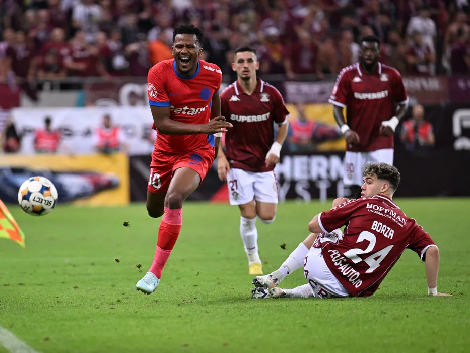 Siyabonga Ngezana si Sebastian Andrei Borza in meciul de fotbal dintre Rapid Bucuresti si FCSB, din cadrul Superligii Superbet, desfasurat pe Arena Nationala din Bucuresti, duminica 17 august 2025. © FOTO:Razvan Pasarica/SPORT PICTURES