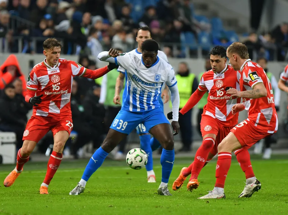 Aimé Steven Nsasa Nsimba si Nikolas Veratschnig, Nadiem Amiri, Andreas Hanche-Olsen in meciul de fotbal dintre Universitatea Craiova si FSV Mainz 05, contand pentru Conference League, desfasurat pe Stadionul Ion Oblemenco din Craiova, joi 27 noiembrie 2025. © FOTO:Daniel George Ilinca/SPORT PICTURES