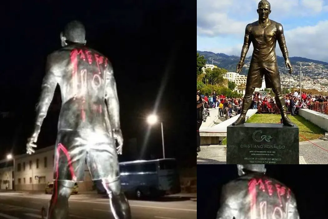 „Este o rușine! Meritați să trăiți în Siria!” FOTO | Statuia lui Ronaldo din orașul natal, vandalizată: CR7 a devenit „Messi 10”. Mesajul plin de furie postat de sora portughezului