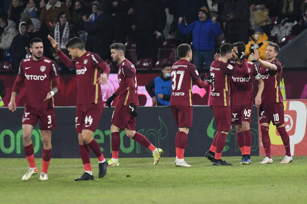 Jucatorii formatiei CFR Cluj reactioneaza dupa ce au inscris un gol in timpul meciului de fotbal contra echipei Rapid din etapa a XXVII - a a Ligii 1, disputat pe stadionul Dr. Constantin Radulescu, duminica, 20 februarie 2022. FLAVIU BUBOI / MEDIAFAX FOTO