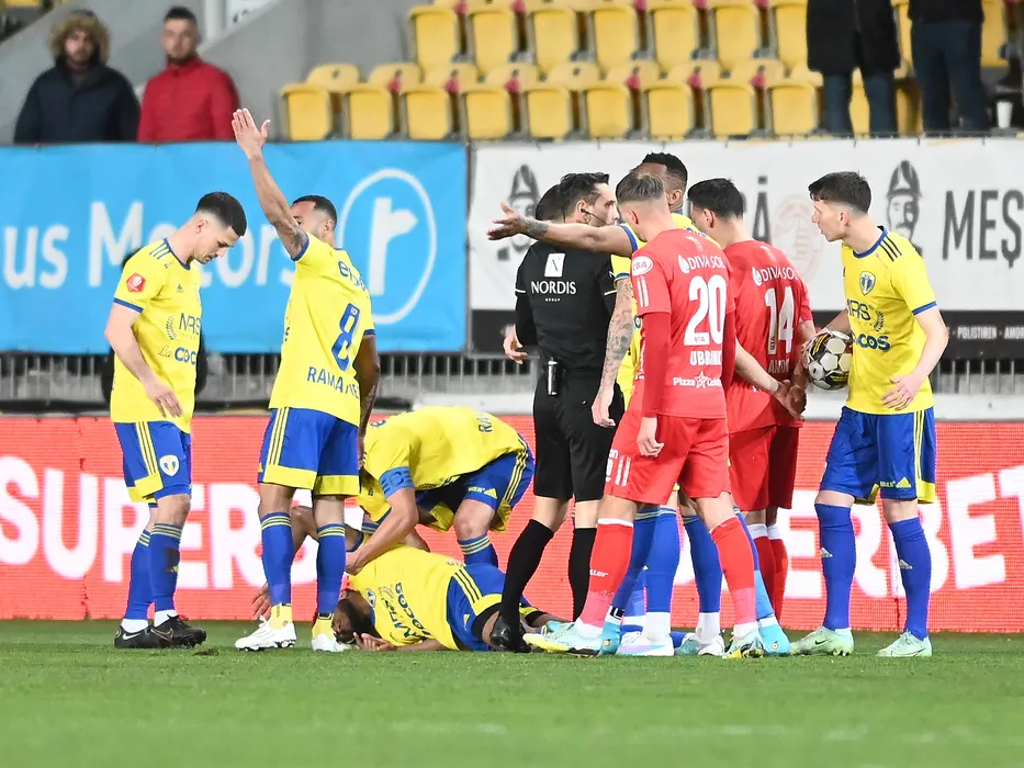 Felix Mathaus Lima Santos la pamant alaturi de fotbalistii ploiesteni si arbitrul central Sebastian Coltescu in meciul de fotbal dintre Petrolul Ploiesti si UTA Arad, contand pentru Superliga Superbet, desfasurat pe Stadionul Ilie Oana din Ploiesti, vineri 17 martie 2023. © FOTO:Razvan Pasarica/SPORT PICTURES