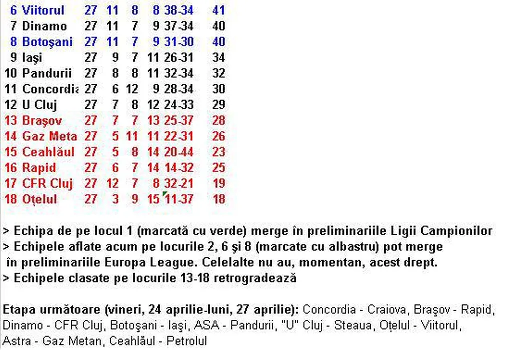 Etapa 27: 10 date statistice. Oțelul obține cu Steaua prima victorie după 5 luni. ASA pierde puncte după 6 meciuri. Dinamo depășește campioana în clasamentul returului. Rapid, liderul audienței din Liga 1