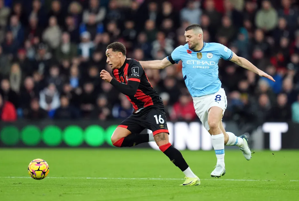 02 November 2024, United Kingdom, Bournemouth: Bournemouth's Marcus Tavernier and Manchester City's Mateo Kovacic (R) battle for the ball during the English Premier League soccer match between AFC Bournemouth and Manchester City at the Vitality Stadium. Photo: Adam Davy/PA Wire/dpa