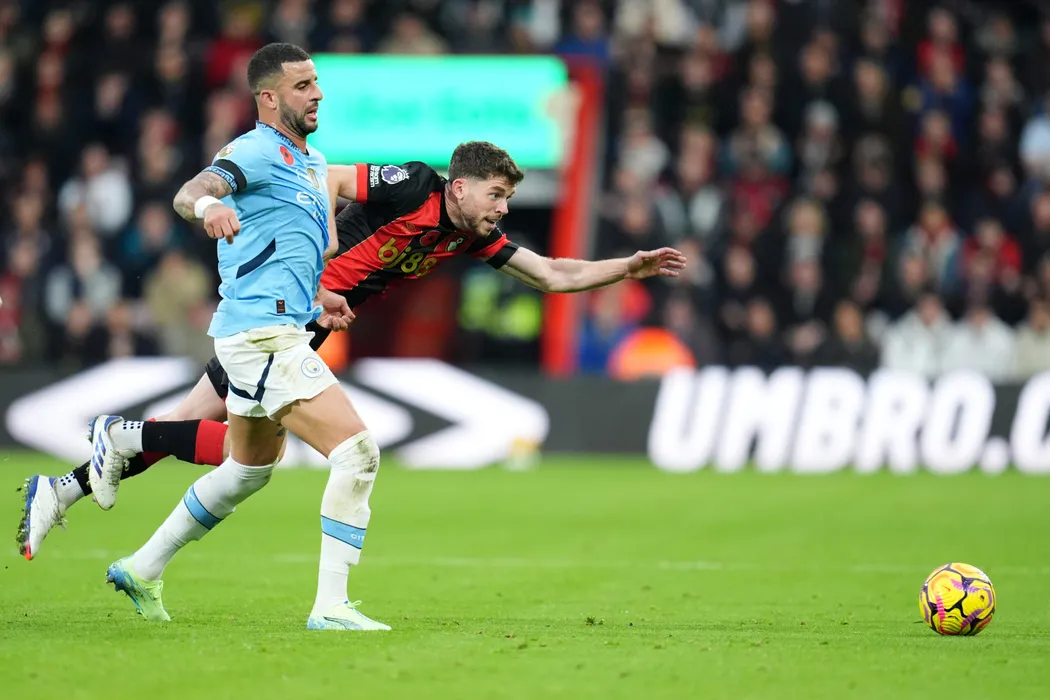 02 November 2024, United Kingdom, Bournemouth: Manchester City's Kyle Walker and Bournemouth's Ryan Christie (R) battle for the ball during the English Premier League soccer match between AFC Bournemouth and Manchester City at the Vitality Stadium. Photo: Adam Davy/PA Wire/dpa