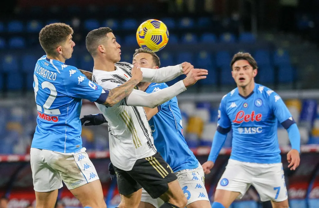 February 13, 2021, Naples, Campania, Italy: Cristiano Ronaldo of Juventus in a contrast against Giovanni di Lorenzo of Napoli..During the Italian Serie A Football match SSC Napoli vs FC Juventus on February 13, 2021 at the Diego Armano Maradona stadium in Naples.,Image: 590833178, License: Rights-managed, Restrictions: , Model Release: no