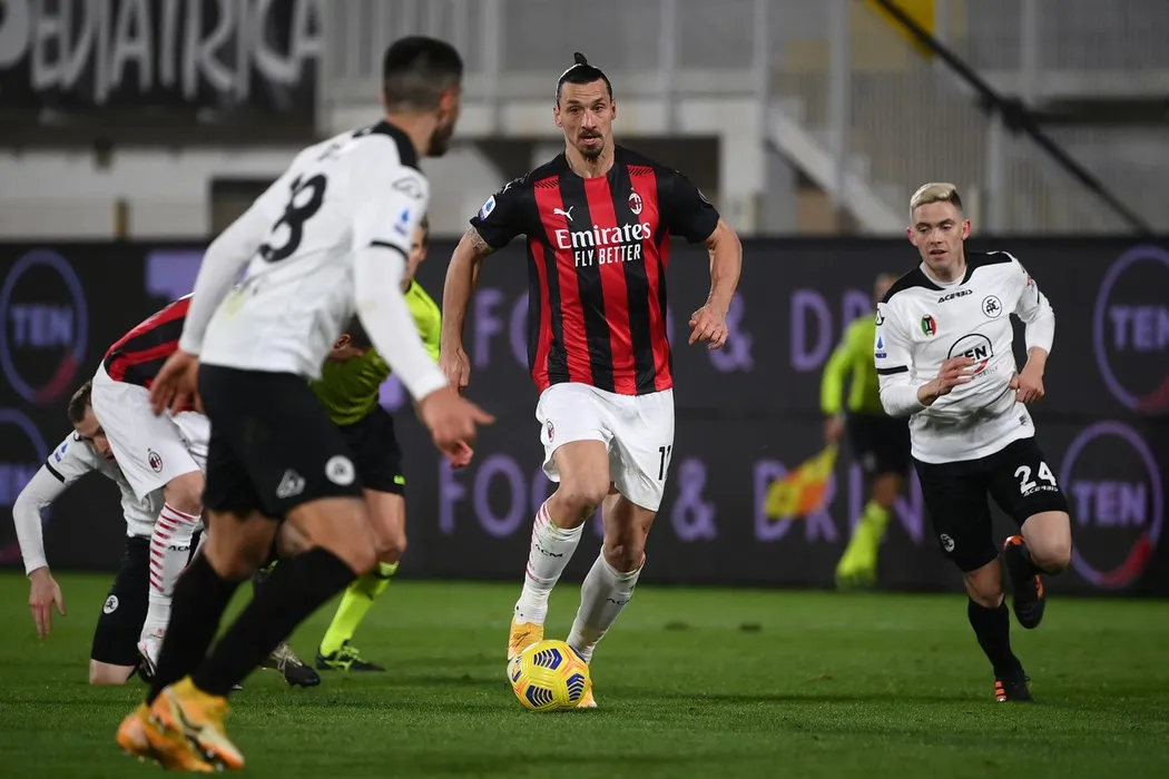AC Milan's Swedish forward Zlatan Ibrahimovic (C) challenges Spezia's Croatian defender Martin Erlic (L) and Spezia's Argentine midfielder Nahuel Estevez (R) during the Italian Serie A football match Spezia vs AC Milan on February 13, 2021 at the Alberto-Picco stadium in La Spezia.,Image: 590830175, License: Rights-managed, Restrictions: , Model Release: no