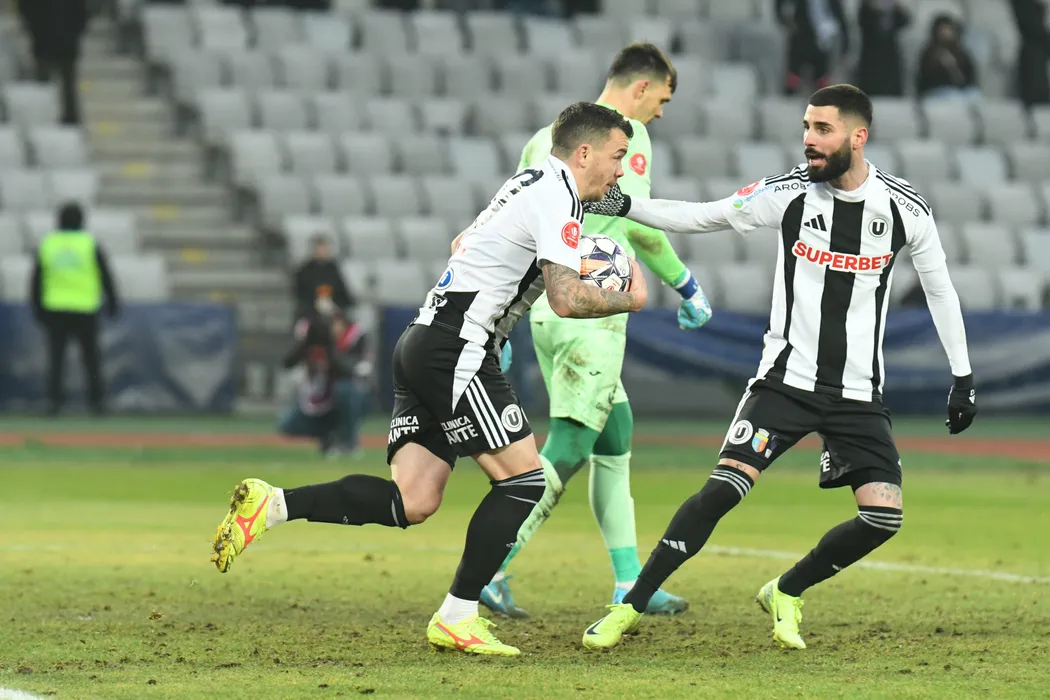 Dan Nicolae Nistor felicitat de Radu Stefanita Boboc dupa ce a inscris din lovitura de la 11m in meciul de fotbal dintre FC Universitatea Cluj si Gloria Buzau, din cadrul Superligii Superbet, desfasurat pe Stadionul Cluj Arena din Cluj-Napoca, sambata 18 ianuarie 2025. © FOTO:Flaviu Buboi/SPORT PICTURES