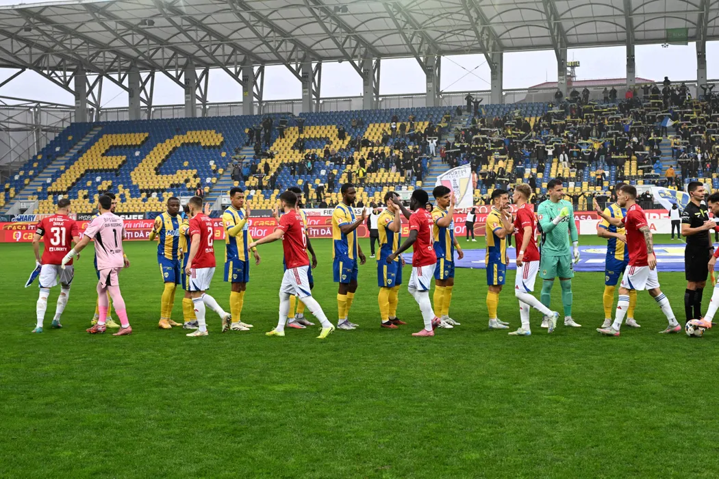 Fotbalistii celor doua echipe se saluta inaintea meciului dintre Petrolul Ploiesti si Otelul Galati, contand pentru Superliga Superbet, desfasurat pe Stadionul Ilie Oana din Ploiesti, sambata 8 noiembrie 2025. © FOTO:Razvan Pasarica/SPORT PICTURES