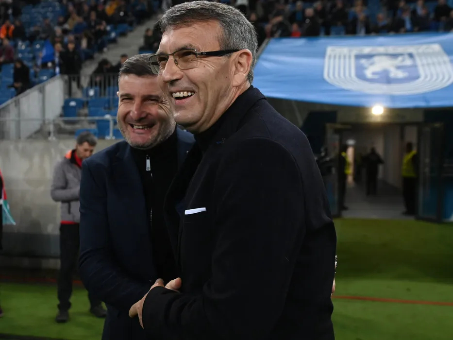 Cei doi antrenori Eugen Neagoe si Laszlo Gyorgy Balint se saluta inaintea meciului de fotbal dintre Universitatea Craiova si UTA Arad, contand pentru Superliga Superbet, desfasurat pe Stadionul Ion Oblemenco din Craiova, vineri 10 martie 2023. © FOTO:Razvan Pasarica/SPORT PICTURES