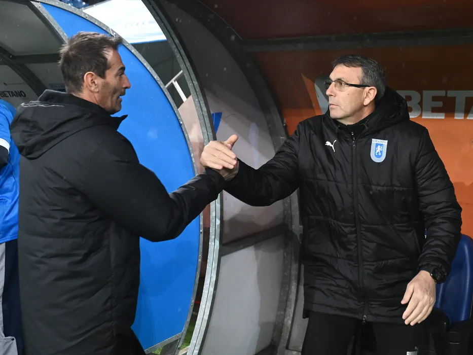 Cei doi antrenori Eugen Neagoe si Marius Maldarasanu se saluta inaintea meciului de fotbal dintre Universitatea Craiova si FC Hermannstadt, contand pentru Superliga Superbet, desfasurat pe Stadionul Ion Oblemenco din Craiova, sambata 28 ianuarie 2023. © FOTO:Razvan Pasarica/SPORT PICTURES