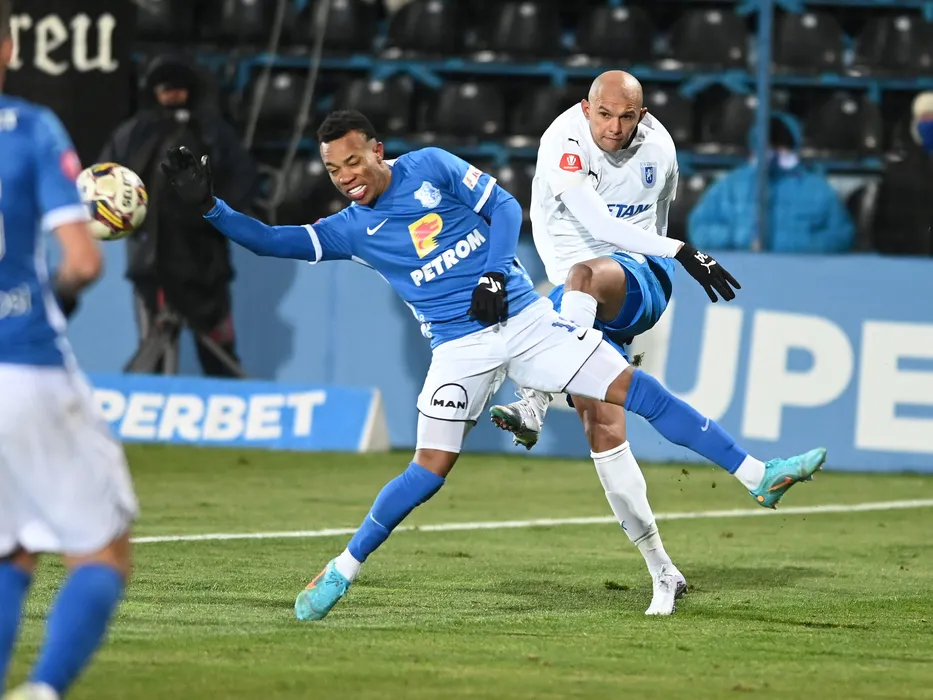 Mateus Santos Barbosa si Raul Michel Melo Da Silva in meciul de fotbal dintre Farul Constanta si Universitatea Craiova, contand pentru Superliga Superbet, desfasurat pe Stadionul central al Academiei Gheorghe Hagi din Ovidiu, luni 6 februarie 2023. © FOTO:Razvan Pasarica/SPORT PICTURES