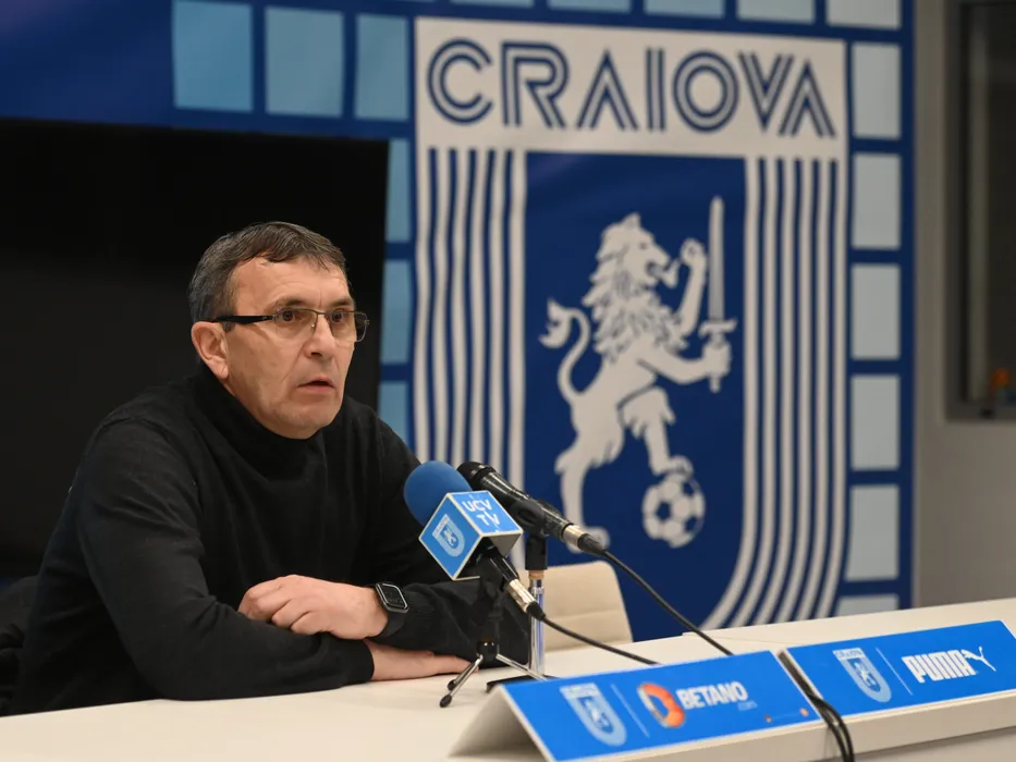Eugen Neagoe discuta cu jurnalistii la conferinta de presa de dupa meciul de fotbal dintre Universitatea Craiova si CFR Cluj, contand pentru Superliga Superbet, desfasurat pe Stadionul Ion Oblemenco din Craiova, sambata 11 februarie 2023. © FOTO:Razvan Pasarica/SPORT PICTURES
