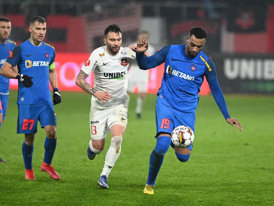 Darius Dumitru Olaru, Ilie Alexandru Rauta si Abdel Slem Billel Omrani in meciul de fotbal dintre FC Hermannstadt si FCSB, contand pentru Superliga Superbet, desfasurat pe Stadionul Municipal din Sibiu, duminica 22 ianuarie 2023. © FOTO:Razvan Pasarica/SPORT PICTURES