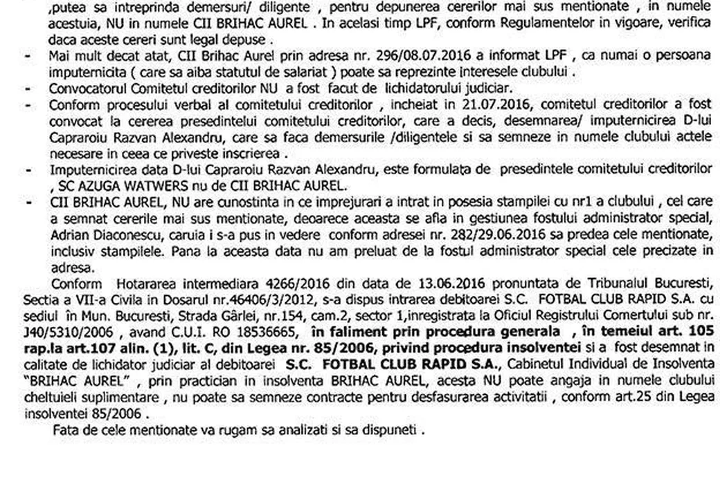 EXCLUSIV Document: adresa oficială prin care lichidatorul judiciar al Rapidului notifică FRF și LPF că actele depuse pentru înscrierea clubului sunt nule. Cazul merge în penal: „Este fals în înscrisuri”