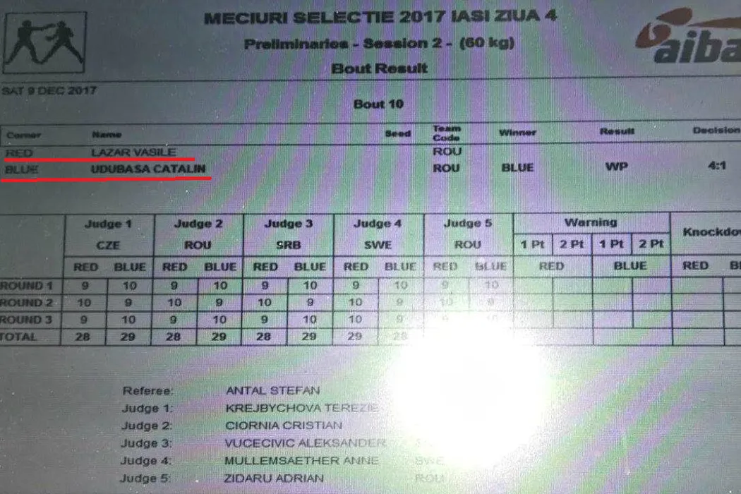 EXCLUSIV | Meci-fantomă „organizat” de FR Box sub tutela AIBA. Conform fișei, la Centura Moldovei „au urcat” în ring doi membri ai Biroului Federal! Cei doi se miră, AIBA și federația se comportă ciudat, arbitra cehă nu mai ține minte | FOTO cu actul fals