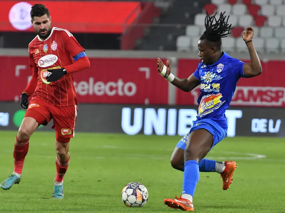 Mouhamadou Keita și Florin Bogdan Ștefan în meciul de fotbal dintre Sepsi OSK Sfantu Gheorghe și Gloria Buzău, contând pentru SuperLiga Superbet, desfășurat pe Stadionul SEPSI Arena OSK din Sfântu Gheorghe, vineri 22 noiembrie 2024. © FOTO: Bogdan BALAS/SPORT PICTURES