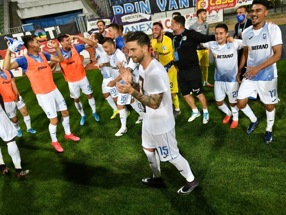 Fotbalistii si staff-ul Universitatii Craiova se bucura intr-o fotografie de grup realizata dupa victoria din meciul de fotbal impotriva celor de la FC Botosani, contand pentru play-off-ul Ligii 1 Casa Pariurilor, disputat fara spectatori pe Stadionul Municipal din Botosani, duminica 19 iulie 2020. © FOTO:Razvan Pasarica/SPORT PICTURES