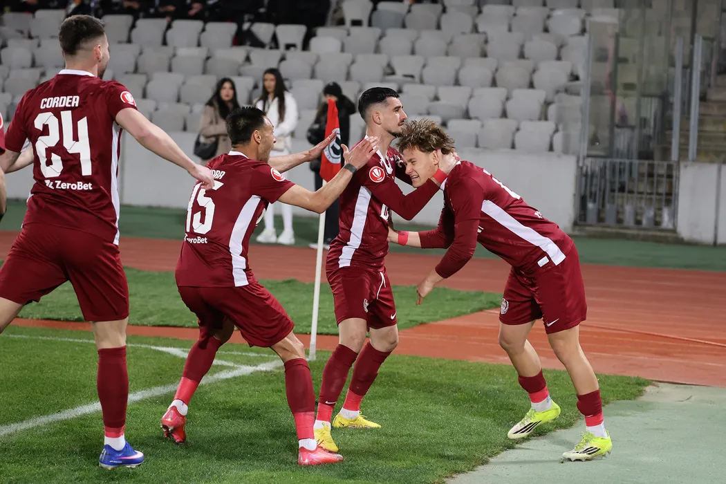 Lorenzo Biliboc (D), de la CFR Cluj, reactioneaza dupa ce a inscris un gol in timpul meciului de fotbal contra echipei Universitatea Cluj din prima etapa a play-off-ului Superligii, disputat pe Cluj Arena din Cluj-Napoca, luni, 16 martie 2026. LUCIAN DANCIU / MEDIAFAX FOTO