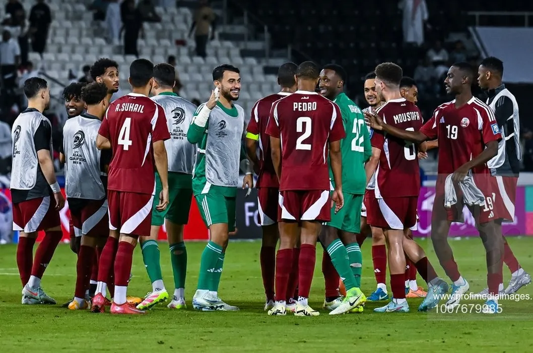Players of Qatar celebrate after winning the FIFA World Cup 2026 AFC Asian Qualifiers Group A third round match between Qatar and Iran at Jassim Bin Hamad Stadium in Doha, Qatar, on June 5, 2025.