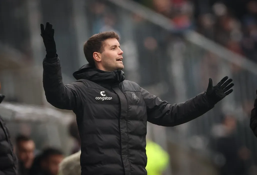 01 April 2023, Hamburg: Soccer: 2nd Bundesliga, Matchday 26, FC St. Pauli - Jahn Regensburg at Millerntor Stadium. St. Pauli coach Fabian Hürzeler gestures on the sidelines. Photo: Christian Charisius/dpa - IMPORTANT NOTE: In accordance with the requirements of the DFL Deutsche Fußball Liga and the DFB Deutscher Fußball-Bund, it is prohibited to use or have used photographs taken in the stadium and/or of the match in the form of sequence pictures and/or video-like photo series.,Image: 766532849, License: Rights-managed, Restrictions: , Model Release: no