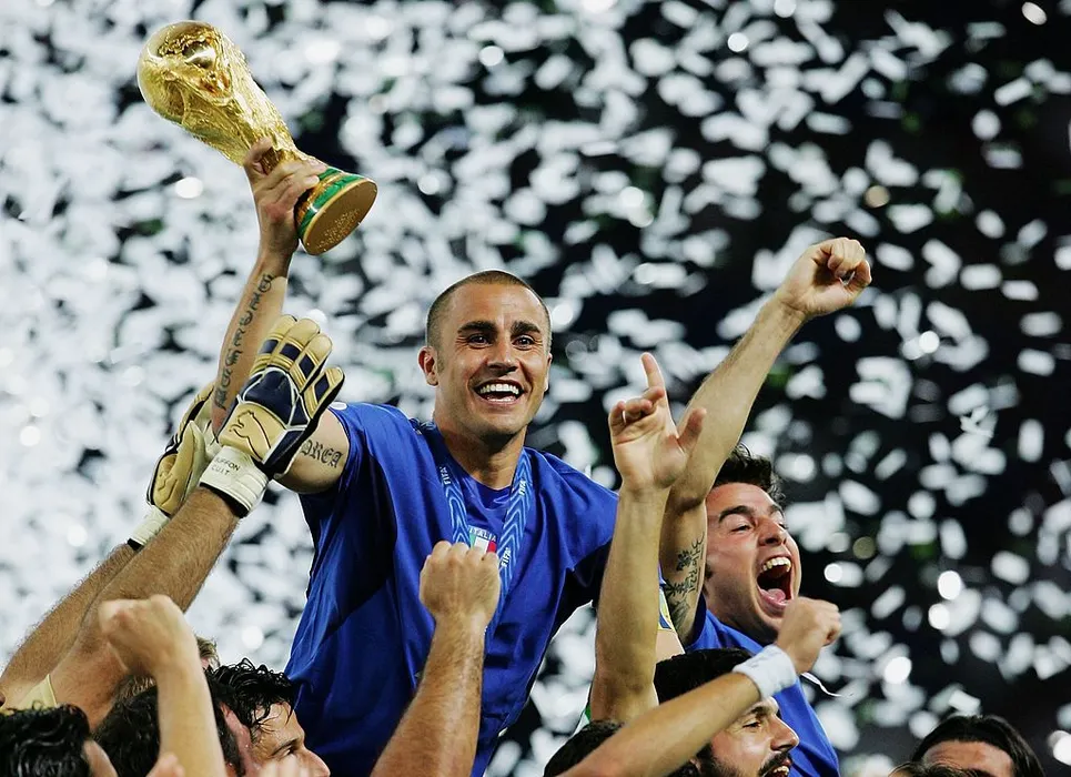 BERLIN - JULY 09: The Italian players celebrate as Fabio Cannavaro of Italy lifts the World Cup trophy aloft following victory in a penalty shootout at the end of the FIFA World Cup Germany 2006 Final match between Italy and France at the Olympic Stadium on July 9, 2006 in Berlin, Germany. (Photo by Alex Livesey/Getty Images)