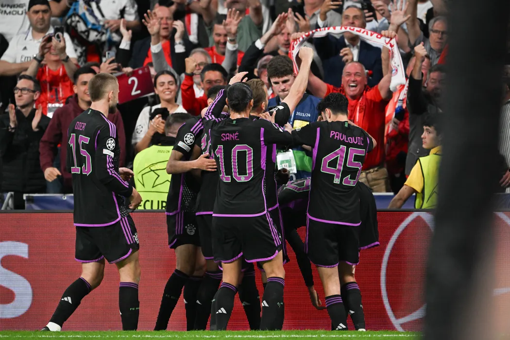 08 May 2024, Spain, Madrid: Munich's players celebrate after Alphonso Davies scored his side's first goal during the UEFA Champions League semi-final, second leg match between Real Madrid and Bayern Munich at the Santiago Bernabeu. Photo: Peter Kneffel/dpa
