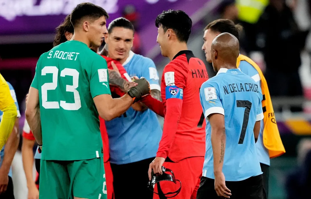 Son Heung-Min of South Korea and Goalkeeper Sergio Rochet of Uruguay shake hands.