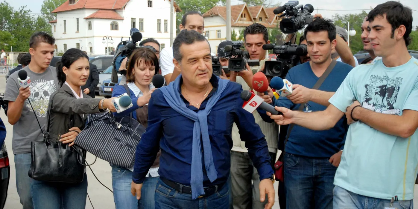 Finantatorul Stelei Gigi Becali inconjurat de ziaristi.