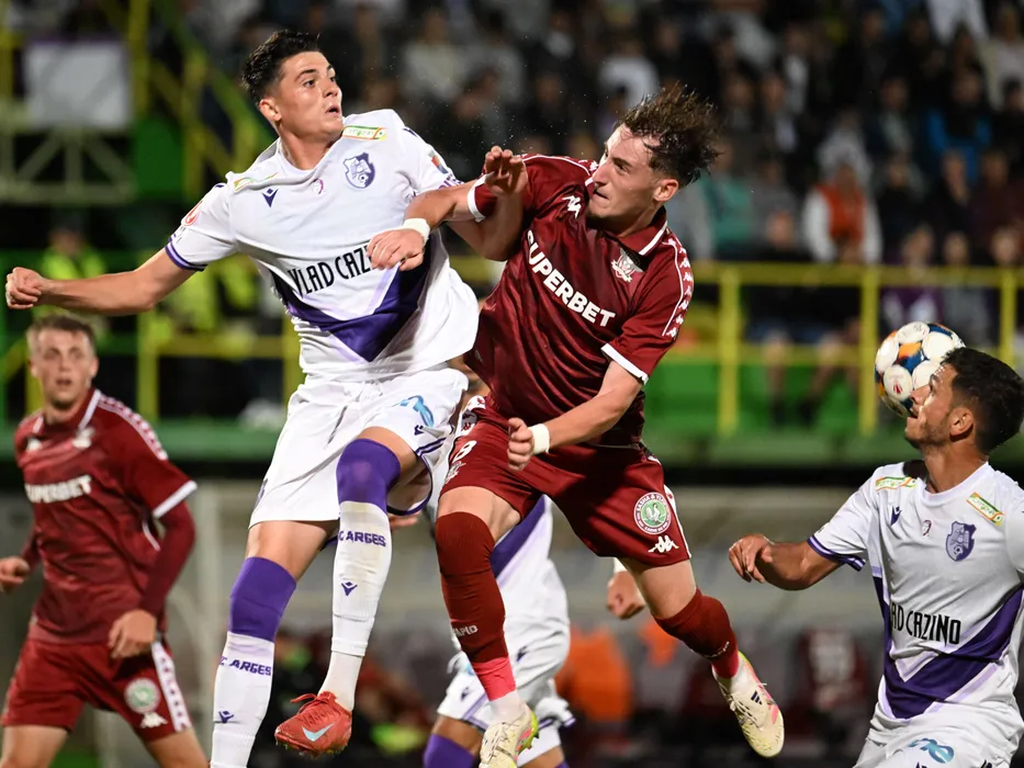 Mario Cristian Tudose, Constantin Grameni si Gabriel Dorinel Oancea in meciul de fotbal dintre FC Arges si Rapid Bucuresti, contand pentru Superliga Superbet, desfasurat pe Stadionul Orasenesc din Mioveni, vineri 11 iulie 2025. © FOTO:Razvan Pasarica/SPORT PICTURES